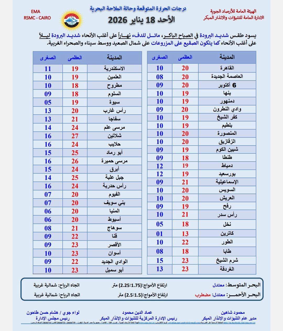 وأوضحت هيئة الأرصاد درجات الحرارة العظمى والصغرى المتوقعة، اليوم، على النحو التالي:
