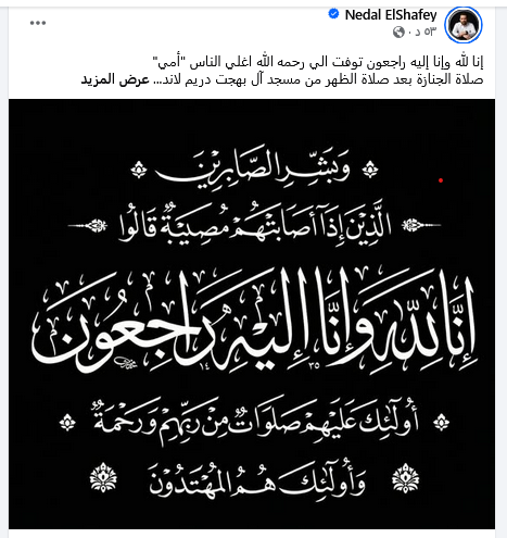 واختتم الفنان منشوره بدعوة جمهوره ومحبيه إلى الدعاء لوالدته بالرحمة والمغفرة، وأن يتغمدها الله بواسع رحمته ويسكنها فسيح جناته، وأن يلهم الأسرة وذويها الصبر والسلوان.