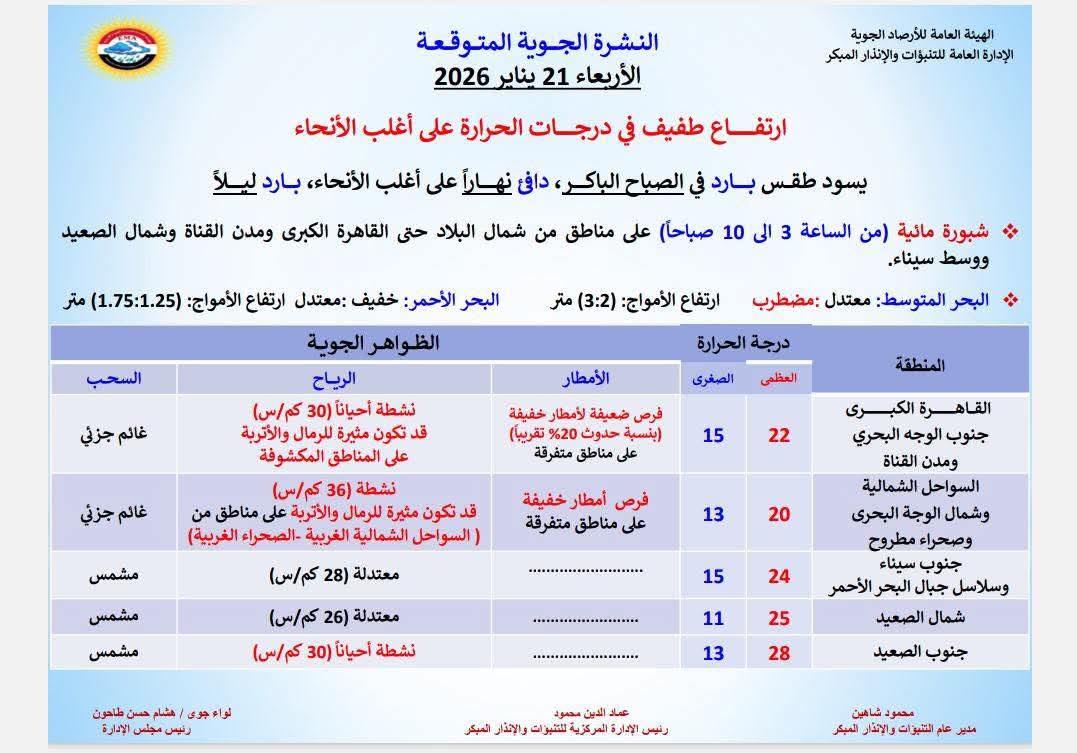 كشفت الهيئة العامة للأرصاد الجوية، عن حالة الطقس اليوم الأربعاء 21 يناير 2026، حيث يسود ارتفاع طفيف في درجات الحرارة على أغلب الأنحاء.