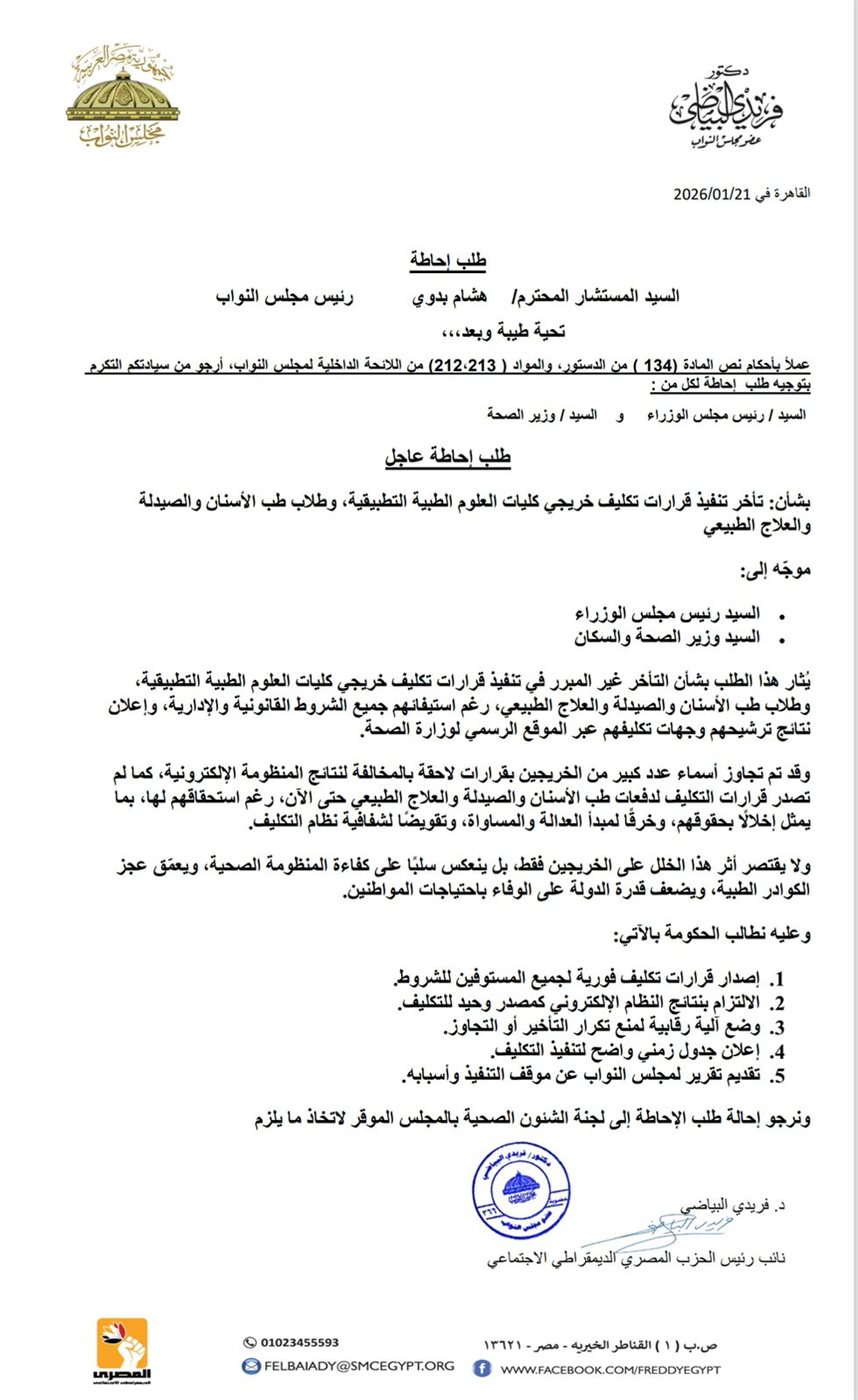 تقدّم النائب فريدي البياضي، عضو مجلس النواب ونائب رئيس الحزب المصري الديمقراطي الاجتماعي، اليوم بطلب إحاطة موجّه إلى كلٍ من رئيس مجلس الوزراء و وزير الصحة والسكان، بشأن التأخر غير المبرر في تنفيذ قرارات تكليف خريجي كليات العلوم الطبية التطبيقية، وطلاب طب الأسنان والصيدلة والعلاج الطبيعي، رغم استيفائهم جميع الشروط القانونية والإدارية، وإعلان نتائج ترشيحهم وجهات تكليفهم عبر الموقع الرسمي لوزارة الصحة.