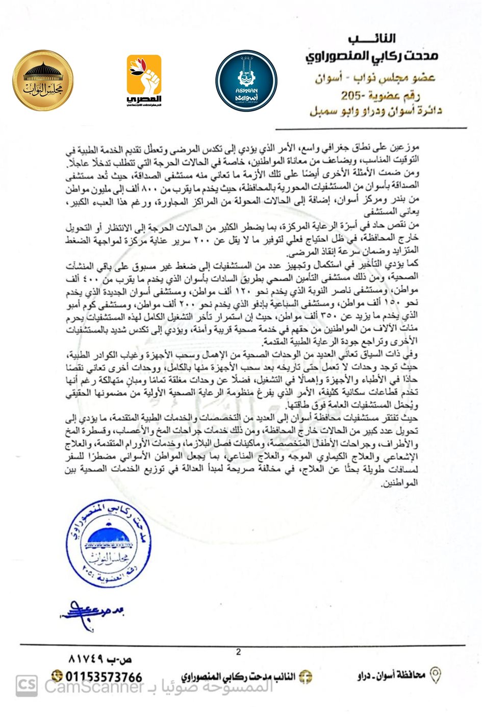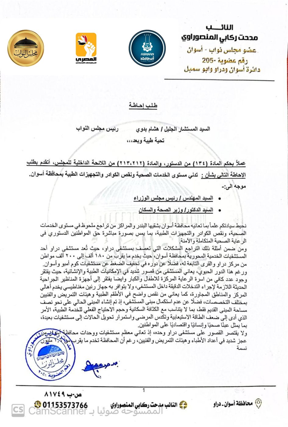تقدّم النائب مدحت ركابي المنصوراوي، عضو مجلس النواب عن الحزب المصري الديمقراطي الاجتماعي، بطلب إحاطة إلى المستشار هشام بدوي رئيس مجلس النواب، موجّهًا إلى رئيس مجلس الوزراء ووزير الصحة والسكان، بشأن التدني الحاد في مستوى الخدمات الصحية ونقص الكوادر والتجهيزات الطبية بمحافظة أسوان.