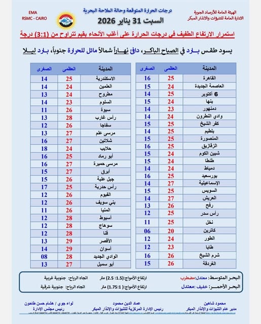 حذرت الهيئة العامة للأرصاد الجوية، من حالة الطقس غدا السبت 31 يناير 2026، إذ أكدت استمرار ارتفاع درجات الحرارة على أغلب الأنحاء بقيم تتراوح من (1 : 3) درجات مئوية، ويكون الطقس نهاراً: دافئ على أغلب الأنحاء، والطقس ليلاً وفي الصباح الباكر: بارد.