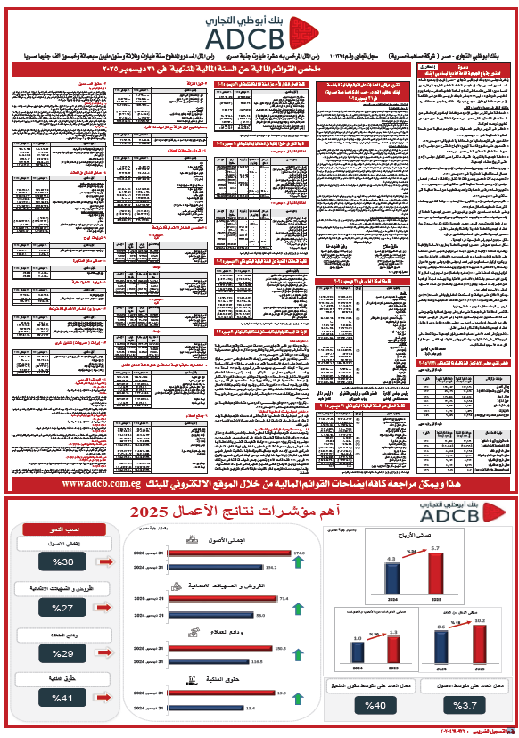 نمو استثنائي.. 5.7 مليار جنيه صافي أرباح بنك أبوظبي التجاري مصر في 2025 بزيادة 34%