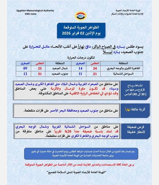 كشفت الهيئة العامة للأرصاد الجوية، حالة الطقس اليوم الاثنين 2 فبراير 2026، حيث تدخل البلاد، بدءاً من الثاني من اليوم 2 فبراير وحتى 11 من نفس الشهر، فترة مناخية حرجة تعرف شعبياً بـ"العزازة".