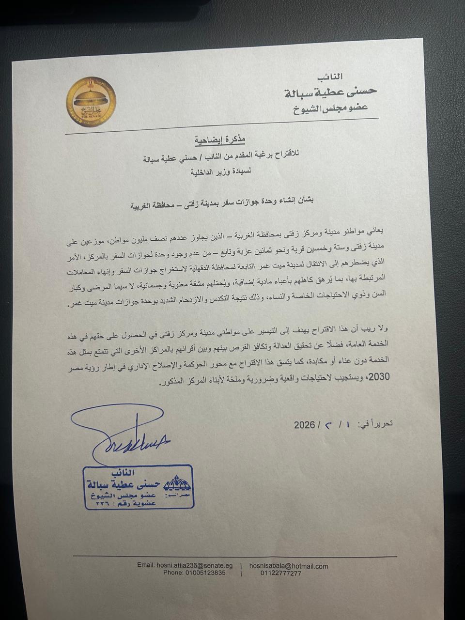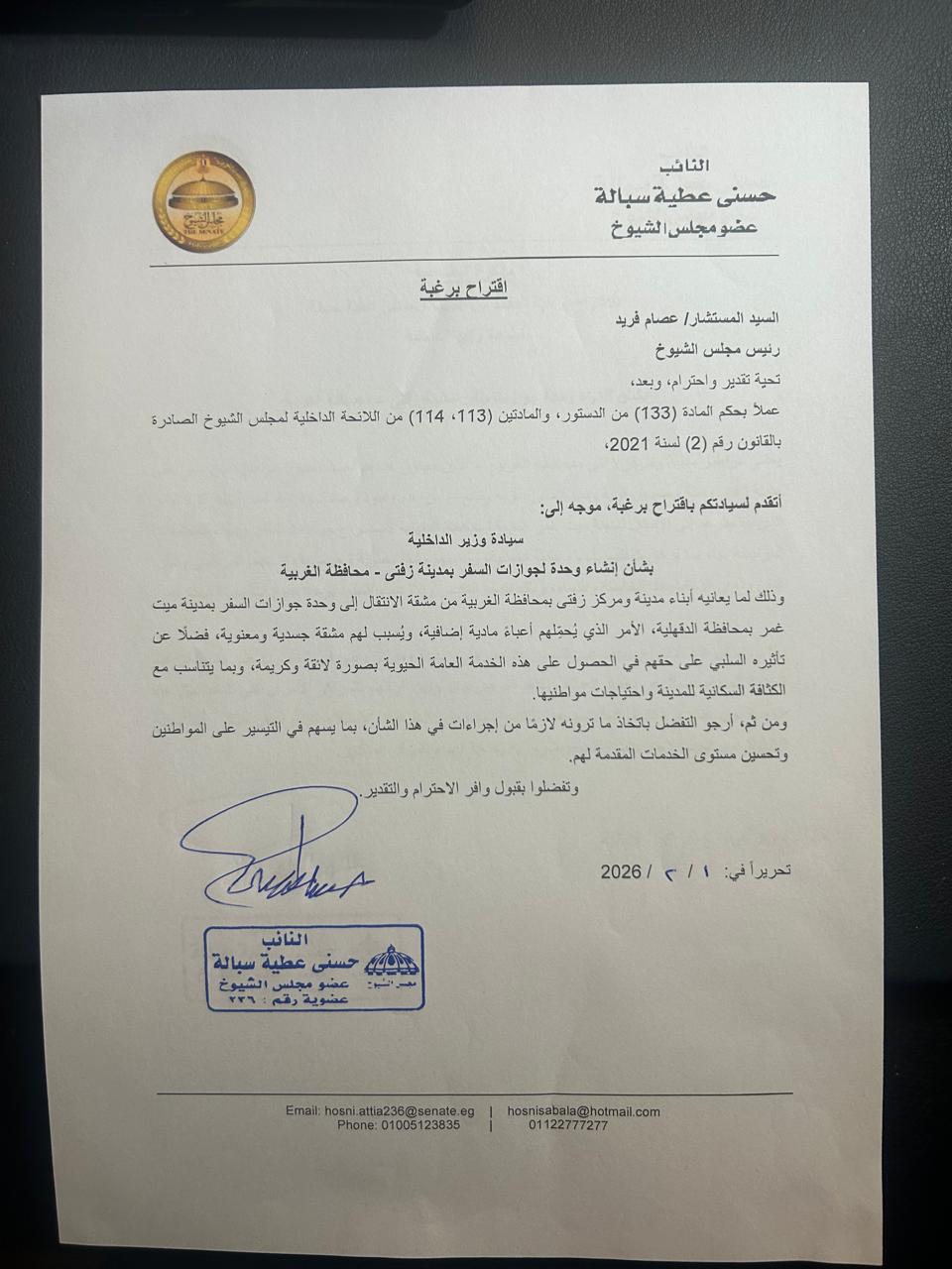 تقدّم النائب حسني عطية سبالة، عضو مجلس الشيوخ عن الحزب المصري الديمقراطي الاجتماعي، باقتراح برغبة موجّه إلى وزير الداخلية، بشأن إنشاء وحدة لجوازات السفر بمدينة زفتى بمحافظة الغربية، وذلك استجابة لمعاناة أبناء المدينة والمركز من مشقة الانتقال إلى وحدة جوازات السفر بمدينة ميت غمر بمحافظة الدقهلية.