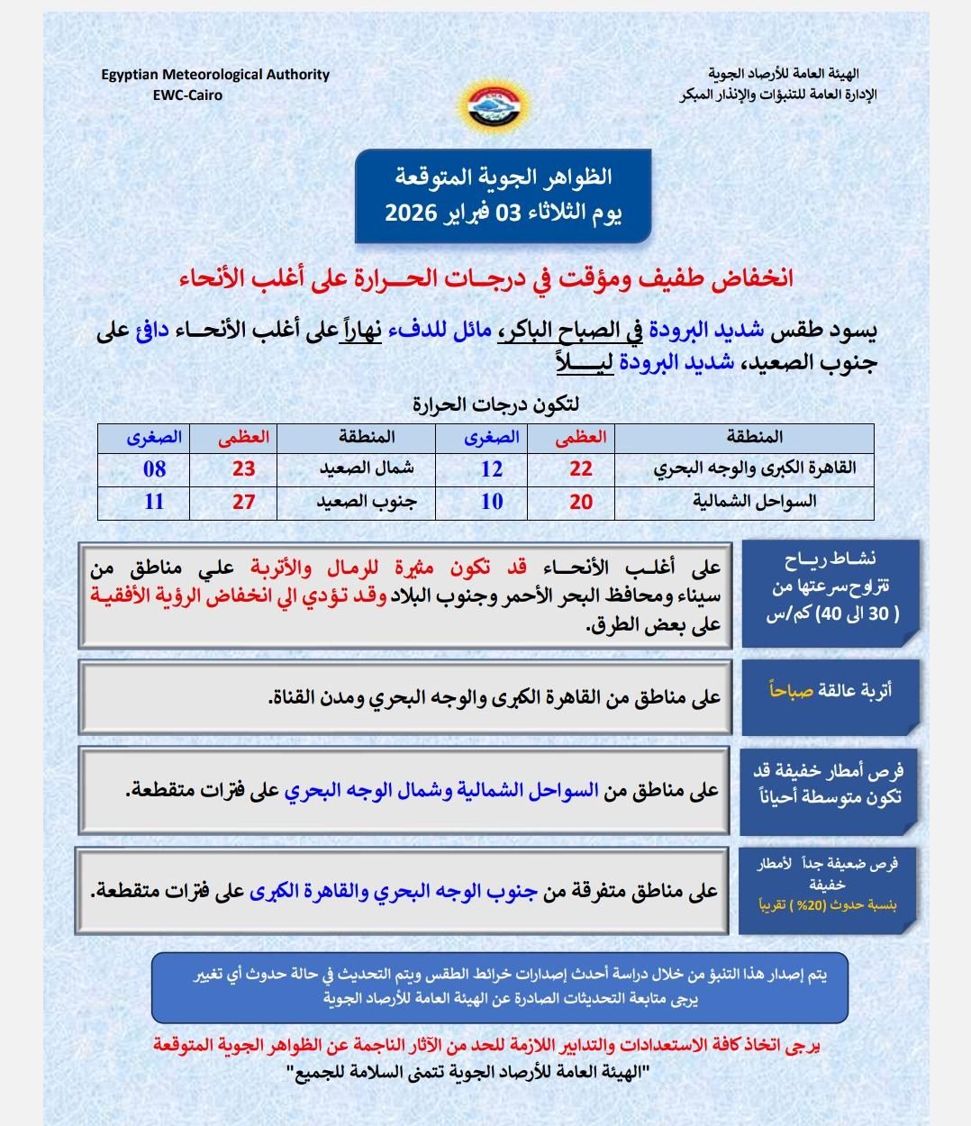 كما لفتت إلى استمرار نشاط الأتربة والرمال المثارة، والتي قد تؤثر سلبًا على مرضى الحساسية الصدرية والجيوب الأنفية، ناصحة بارتداء الكمامات أثناء الخروج في هذه الأجواء.