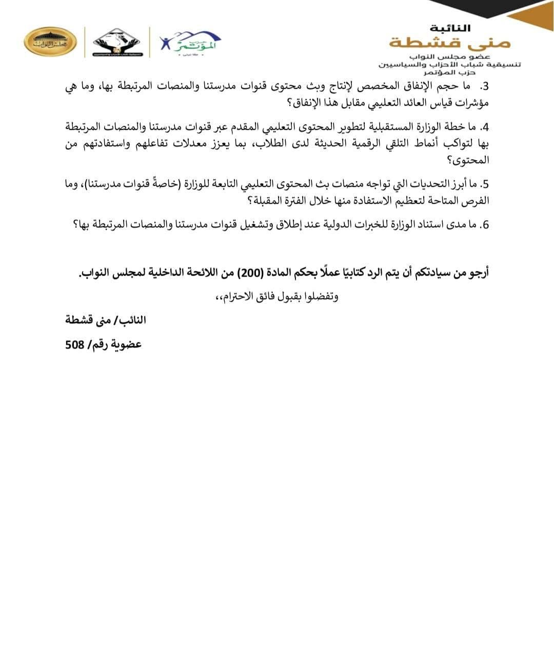وشمل سؤال النائبة عدة استفسارات رئيسية، منها: