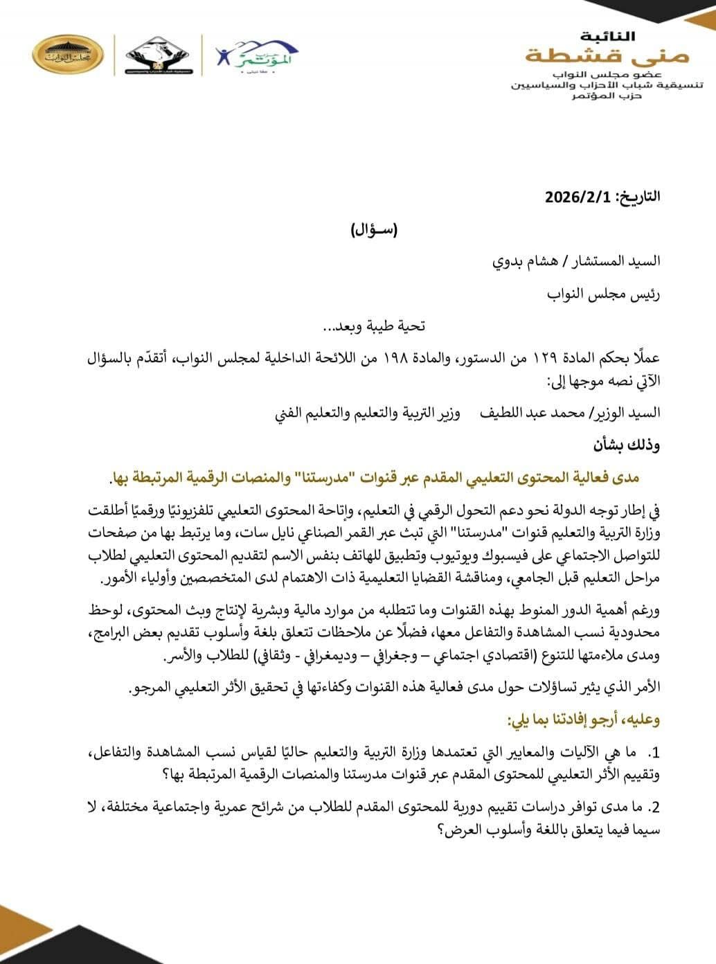 تقدمت النائبة منى قشطة، عضو مجلس النواب، بسؤال موجه إلى وزير التربية والتعليم حول فعالية المحتوى التعليمي المقدم عبر قنوات “مدرستنا” والمنصات الرقمية المرتبطة بها، في إطار متابعة جهود الدولة لدعم التحول الرقمي في التعليم وتطوير أساليب التعلم عن بعد.