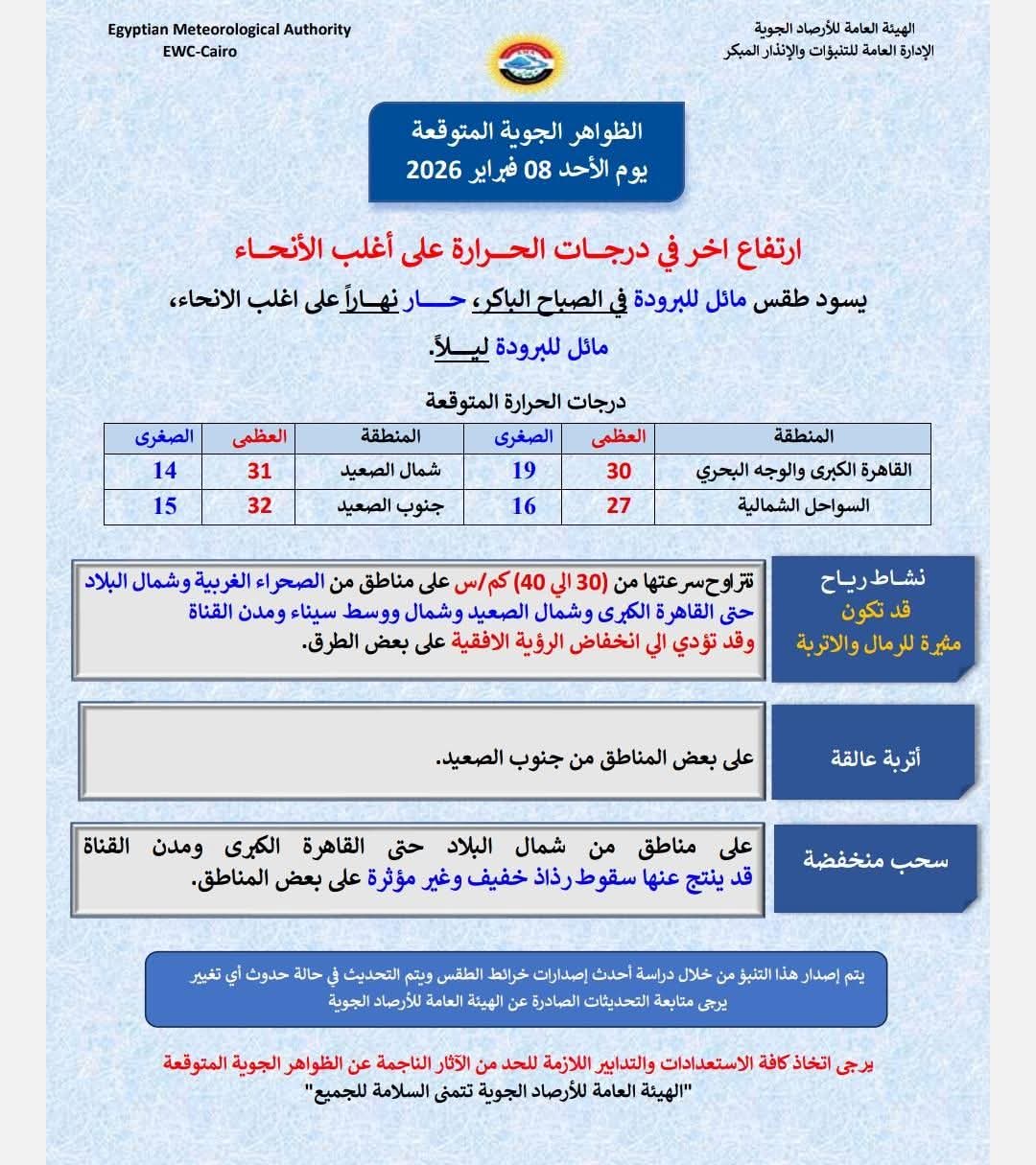 أعلنت الهيئة العامة للأرصاد الجوية أن البلاد تشهد يوم الأحد 8 فبراير 2026 ارتفاعًا جديدًا في درجات الحرارة على أغلب الأنحاء، ليسود طقس مائل للبرودة في الصباح الباكر، حار نهارًا على معظم المناطق، ومائل للبرودة ليلًا.