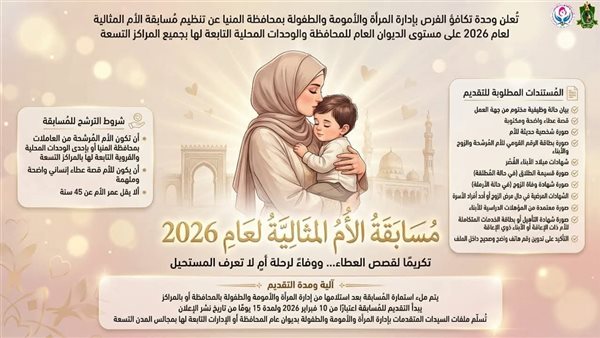 أعلنت وحدة تكافؤ الفرص بإدارة المرأة والطفولة والأمومة بديوان عام محافظة المنيا عن فتح باب التقدم لمسابقة «الأم المثالية» لعام 2026، وذلك تقديرًا لعطاء المرأة وتضحياتها، وتكريمًا للموظفات والعاملات بديوان عام المحافظة والوحدات المحلية للمراكز التسعة.