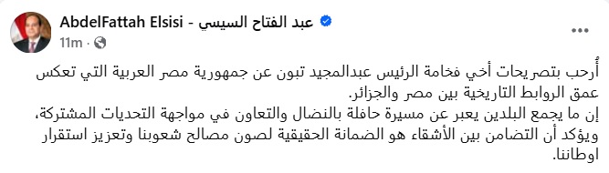قال الرئيس عبد الفتاح السيسى: " أُرحب بتصريحات أخي فخامة الرئيس عبدالمجيد تبون عن جمهورية مصر العربية التي تعكس عمق الروابط التاريخية بين مصر والجزائر.