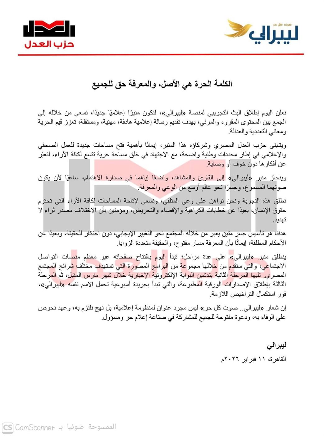 أعلن حزب العدل اليوم عن إطلاق البث التجريبي لمنصة «ليبرالي»، كمنبر إعلامي جديد يهدف إلى الجمع بين المحتوى المقروء والمرئي، وتقديم رسالة إعلامية هادفة ومهنية ومستقلة، تعزز قيم الحرية والتعددية والعدالة.