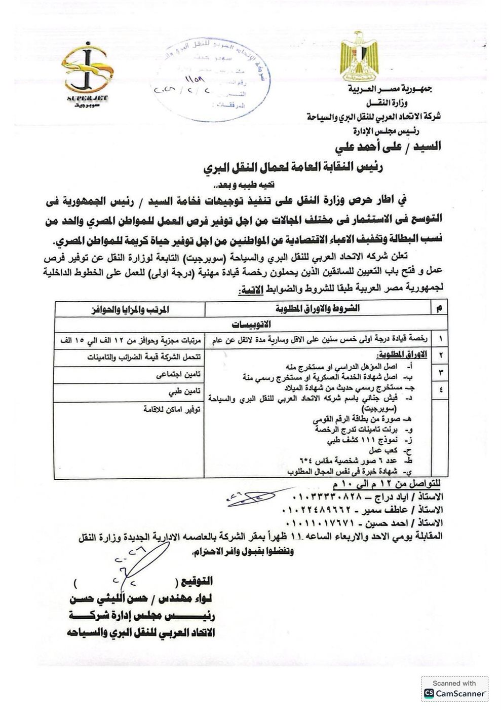 أعلن أشرف الدوكار، رئيس النقابة العامة لعمال النقل البري، عن فتح باب التعيين لسائقين جدد (درجة أولى) بشركة الاتحاد العربي للنقل البري والسياحة (سوبر جيت)، التابعة لوزارة النقل، وذلك للعمل على الخطوط الداخلية لجمهورية مصر العربية.