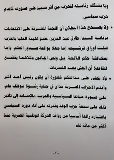 وبحسب مصادر حزبية، تضمنت المذكرة عددًا من الملاحظات المتعلقة بالإجراءات التنظيمية المصاحبة للعملية الانتخابية، إلى جانب اعتراضات على بعض آليات التصويت وإعلان النتيجة، مطالبة لجنة شؤون الأحزاب ببحثها واتخاذ ما يلزم من إجراءات قانونية.