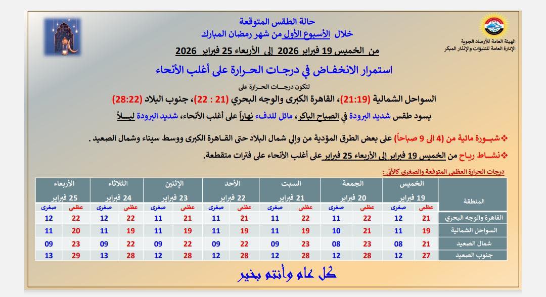 أعلنت الهيئة العامة للأرصاد الجوية تفاصيل حالة الطقس في أول أسبوع لشهر رمضان المبارك من الأربعاء 18 فبراير 2026 حتى الأحد 22 فبراير 2026، عام 1447هـ، مشيرة إلى تعرض البلاد لموجة انخفاض جديدة في درجات الحرارة على معظم الأنحاء.