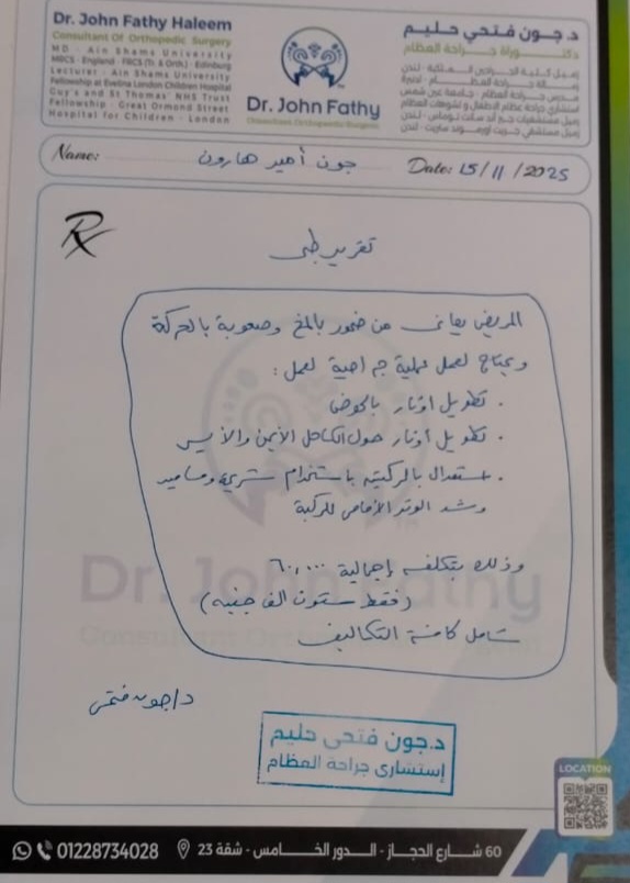 كل يوم تأخير في العلاج أو الإفراج عن السيارة يعني مزيدًا من الألم والمضاعفات لجون، ويزيد العبء النفسي والجسدي على الأسرة.