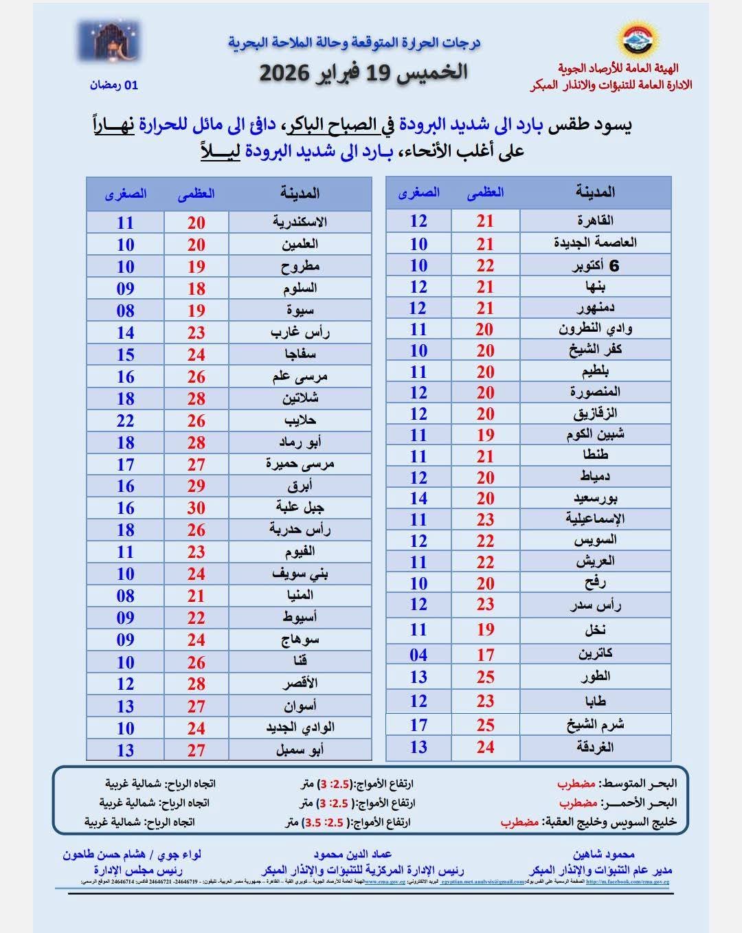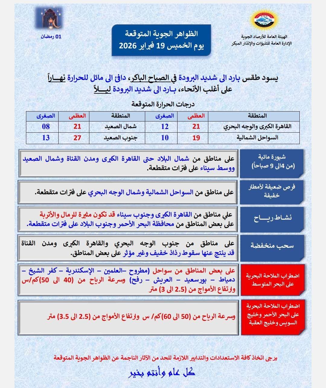 كشفت الهيئة العامة للأرصاد الجوية، حالة الطقس اليوم الخميس 19 فبراير 2026 أول أيام شهر رمضان المبارك.