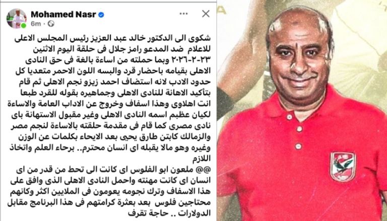 تقدم المخرج محمد نصر بشكوى رسمية إلى المجلس الأعلى لتنظيم الإعلام، اعتراضًا على ما اعتبره إساءة للنادي الأهلي خلال إحدى حلقات برنامج رامز ليفل الوحش الذي يقدمه الفنان رامز جلال.