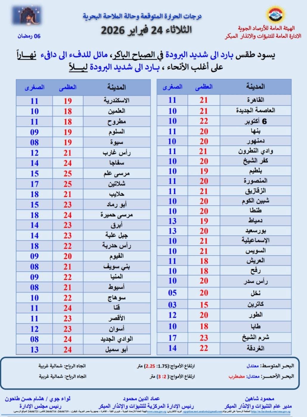 درجات الحرارة المتوقعة اليوم بكافة أنحاء الجمهورية: