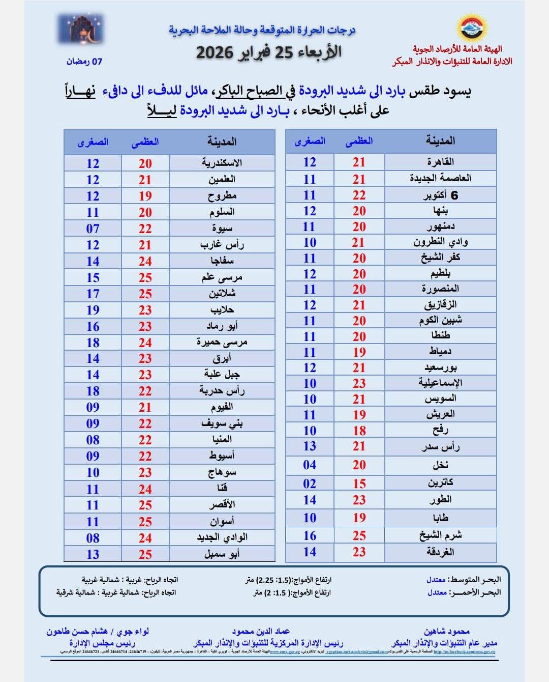 كشفت الهيئة العامة للأرصاد الجوية، حالة الطقس المتوقعة غدا الخميس 26 فبراير 2026.