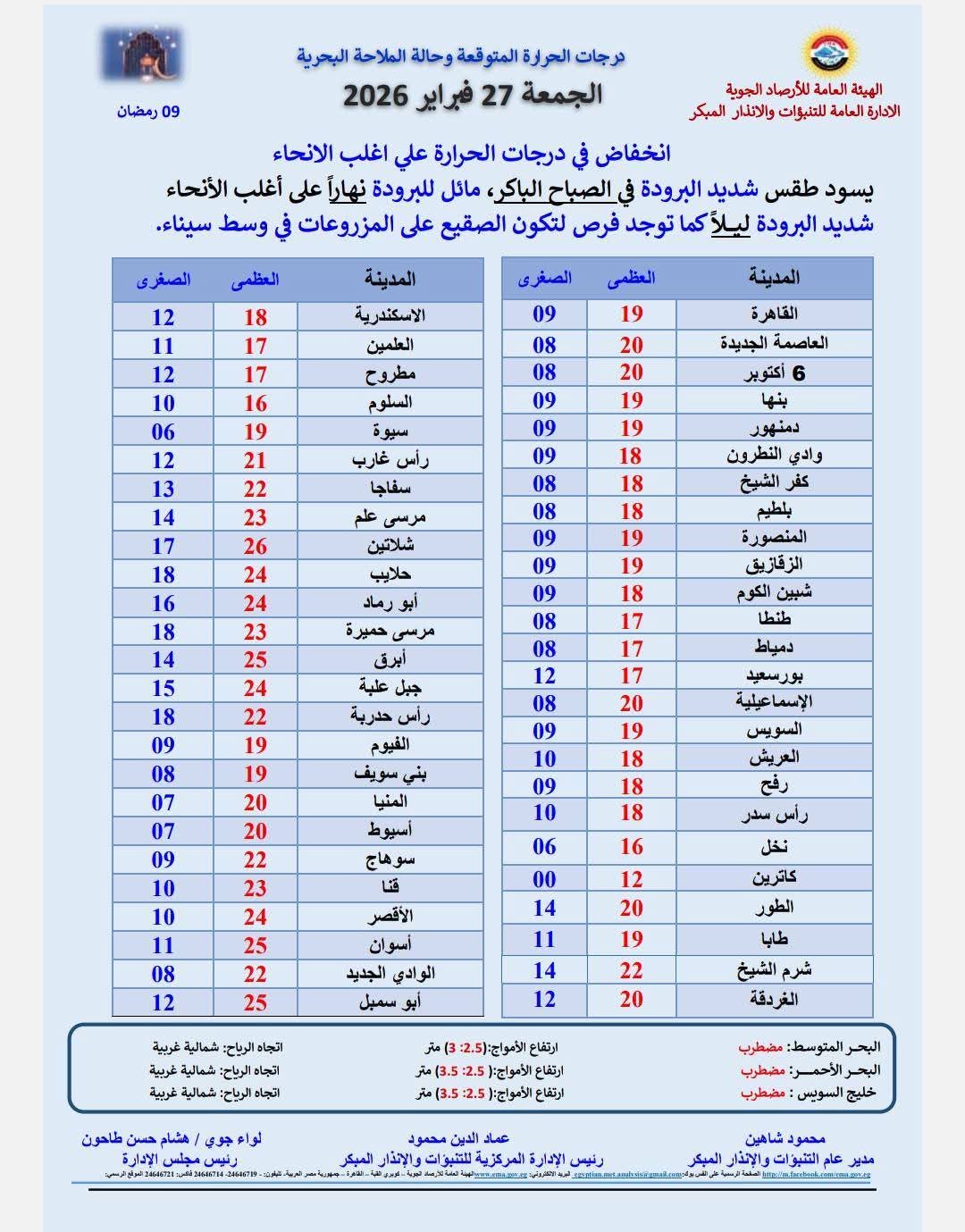 كشفت الهيئة العامة للأرصاد الجوية، عن حالة الطقس المتوقعة اليوم الجمعة 27 فبراير 2026.
