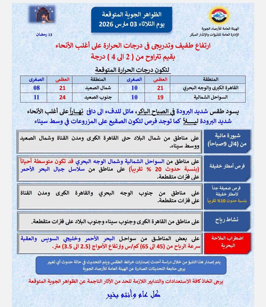 توقعت الهيئة العامة للأرصاد الجوية، حالة الطقس اليوم الثلاثاء، حيث تشير آخر صور للأقمار الصناعية إلى فرص أمطار خفيفة على مناطق من السواحل الشمالية وشمال الوجه البحري قد تكون متوسطة أحياناً (بنسبة حدوث 20% تقريباً) على مناطق من سلاسل جبال البحر الأحمر على فترات متقطعة.