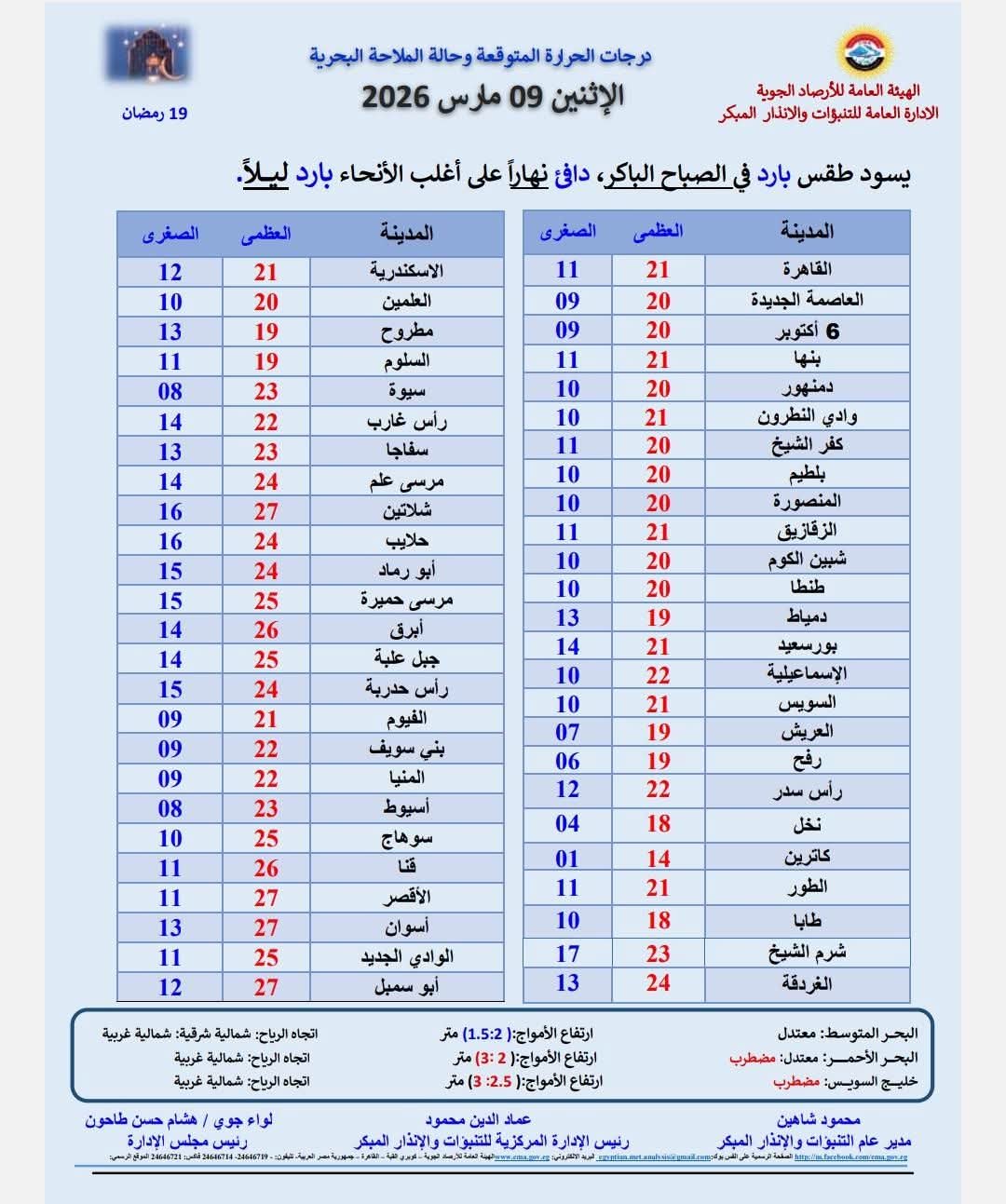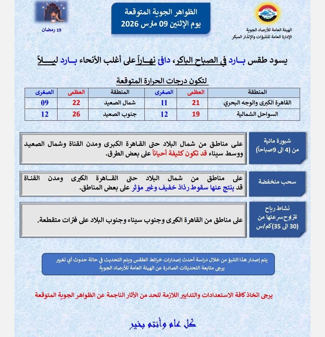 كشفت الهيئة العامة للأرصاد الجوية، حالة الطقس غدا الاثنين 9 مارس 2026، حيث يسود طقس بارد في الصباح الباكر، دافئ نهارًا على أغلب الأنحاء بارد ليلًا.