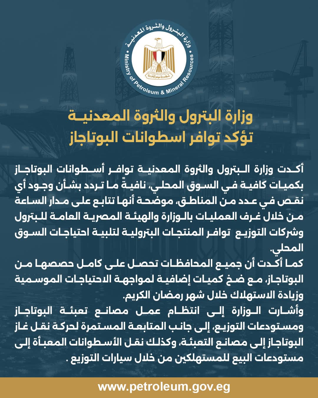 كما أكدت الوزارة أن جميع المحافظات تحصل على كامل حصصها من البوتاجاز، مع ضخ كميات إضافية لمواجهة الاحتياجات الموسمية وزيادة الاستهلاك خلال شهر رمضان الكريم.