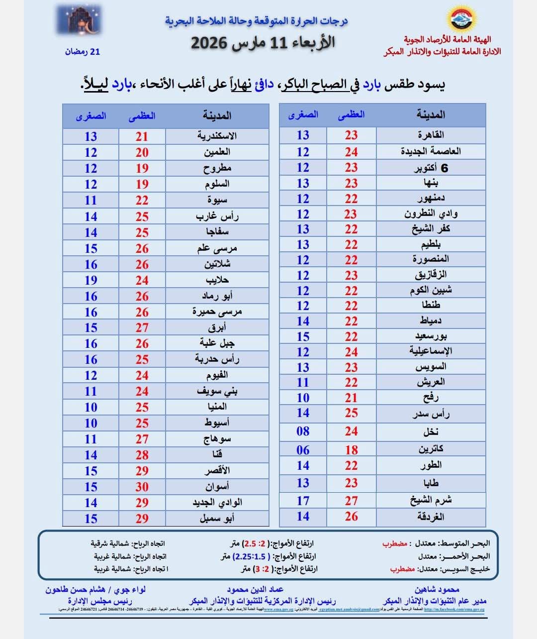 وأوضحت هيئة الأرصاد درجات الحرارة العظمى والصغرى المتوقعة، اليوم الأربعاء، على النحو التالي: