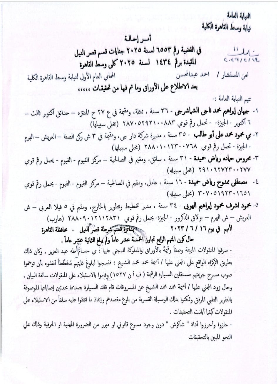 وأفادت التحقيقات أن النيابة أحالت المتهمين، وهم الفنانة جيهان الشماشرجي و4 آخرين إلى محكمة الجنايات المختصة لمحاكمتهم عن الوقائع المنسوبة إليهم، وفقًا لأوراق القضية رقم 6553 لسنة 2025 جنايات قصر النيل، والمقيدة برقم 1434 لسنة 2025 كلي وسط القاهرة.