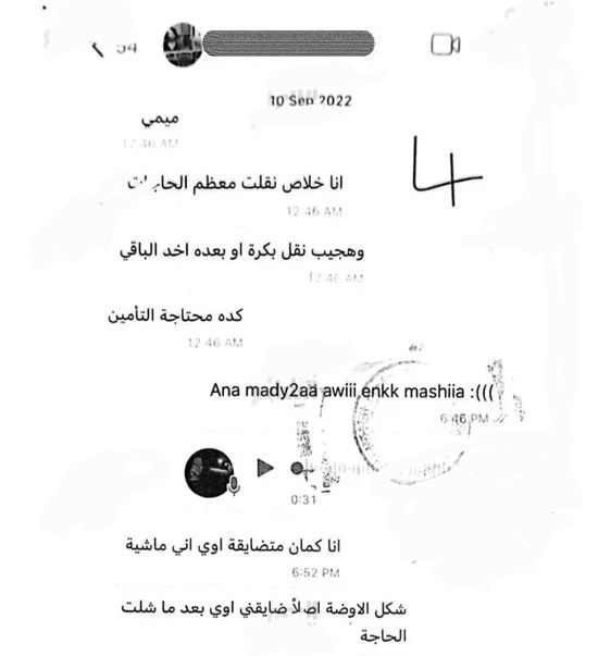 وفي إحدى الرسائل، أوضحت الفنانة أنها قامت بنقل الجزء الأكبر من متعلقاتها الشخصية، وأنها ستستعين بوسيلة نقل في اليوم التالي أو الذي يليه من أجل إحضار باقي الأغراض المتبقية وإخلاء المكان تمامًا. كما أشارت في حديثها إلى مسألة التأمين الخاص بالمكان، في إشارة إلى الإجراءات المتعلقة بإخلاء الغرفة أو إنهاء وجودها داخل الورشة.