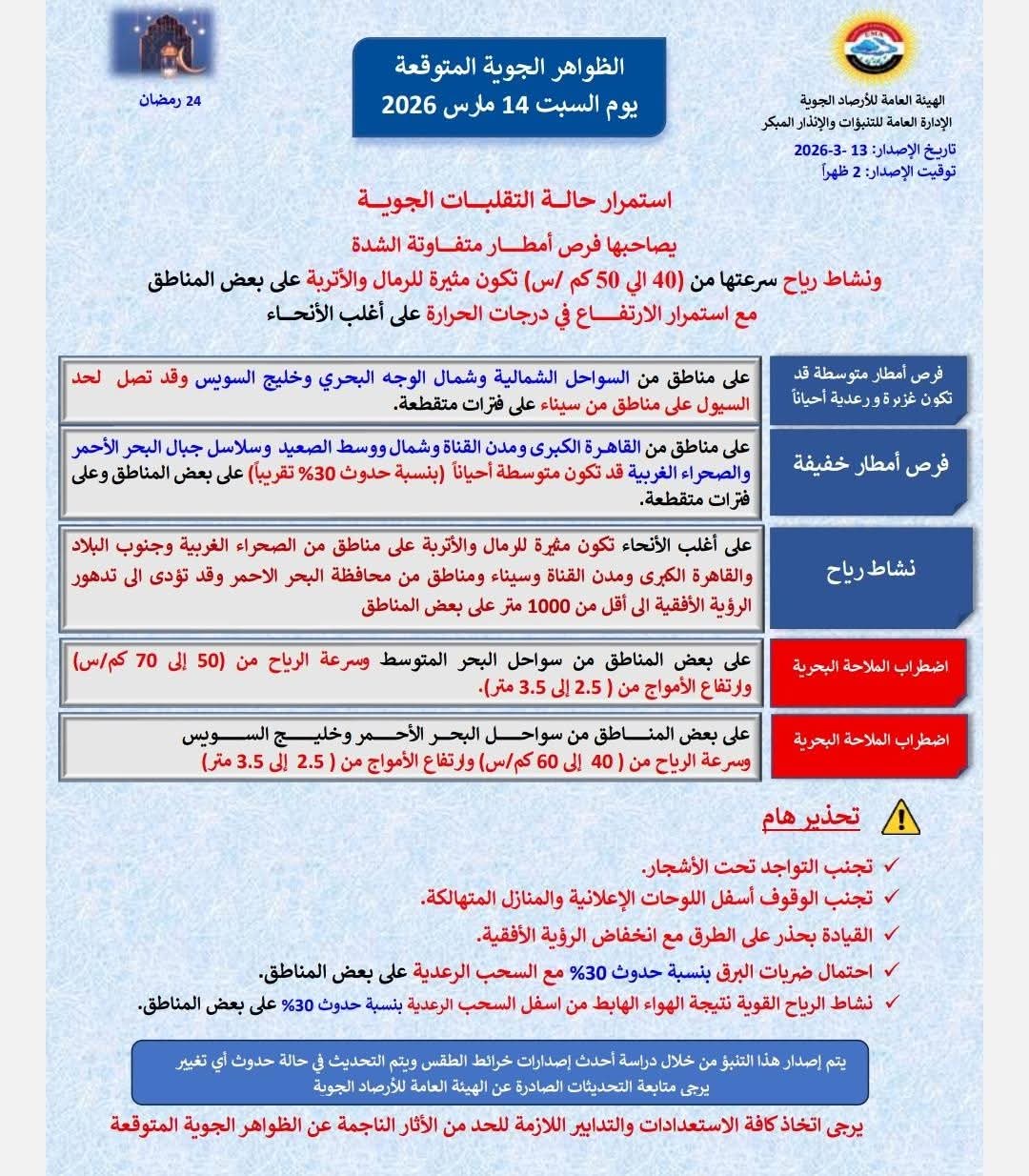 حذرت وزارة الصحة والسكان المواطنين بضرورة توخي الحذر من العواصف الترابية التي تتعرض لها البلاد اليوم السبت.