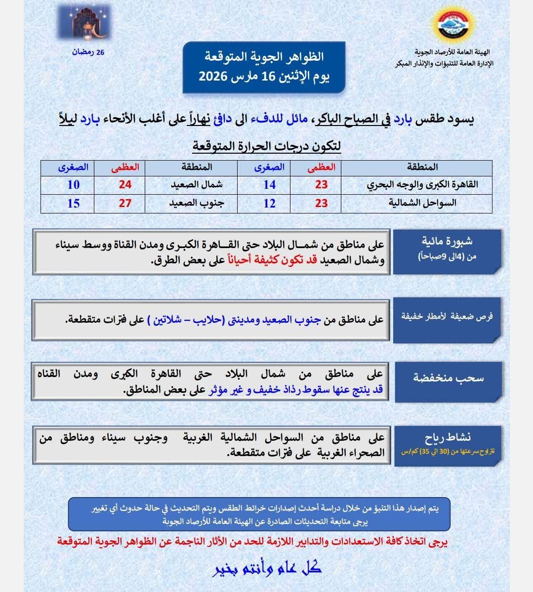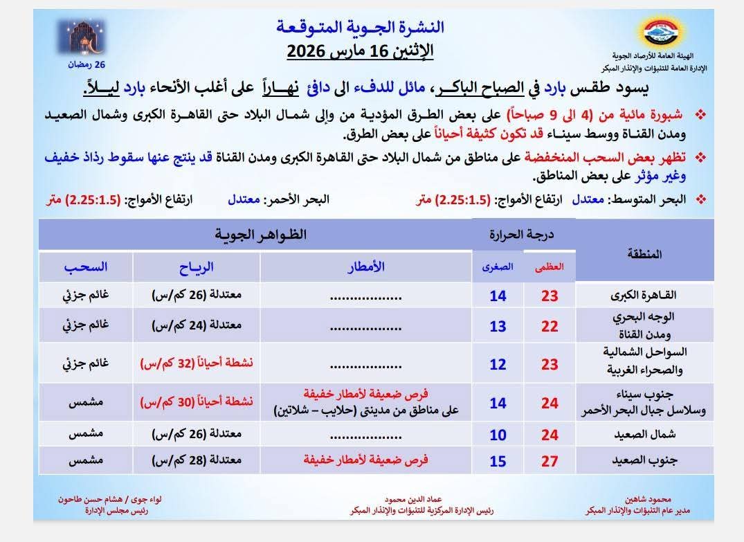 كشفت الهيئة العامة للأرصاد الجوية، حالة الطقس اليوم الاثنين ١٦ مارس ٢٠٢٦، حيث يسود طقس بارد في الصباح الباكر، ومائلا للدفء نهارا على أغلب الأنحاء، وسيكون بارداً ليلاً.