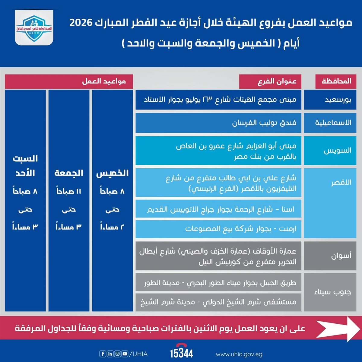 أعلنت الهيئة العامة للتأمين الصحي الشامل، عن مواعيد العمل بفروع الهيئة في عدد من المنافذ بمحافظات تطبيق المنظومة، خلال إجازة عيد الفطر المبارك ٢٠٢٦ وذلك أيام "الخميس والجمعة والسبت والأحد"، في إطار حرص الهيئة على ضمان استمرارية تقديم خدماتها للمستفيدين خلال تلك الفترة.