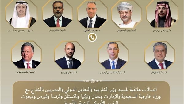 جرت اتصالات هاتفية بين الدكتور بدر عبد العاطي وزير الخارجية والتعاون الدولي والمصريين بالخارج، وكل من الشيخ عبد الله بن زايد نائب رئيس الوزراء ووزير خارجية الإمارات، والأمير فيصل بن فرحان وزير خارجية المملكة العربية السعودية الشقيقة، وبدر البوسعيدي وزير خارجية سلطنة عُمان الشقيقة، وهاكان فيدان وزير خارجية الجمهورية التركية، و إسحاق دار نائب رئيس الوزراء ووزير خارجية جمهورية باكستان الإسلامية، وجان نويل بارو وزير خارجية الجمهورية الفرنسية، و كونستانتينوس كومبوس وزير خارجية قبرص، بالإضافة إلى ستيف ويتكوف المبعوث الأمريكي الخاص للشرق الأوسط.