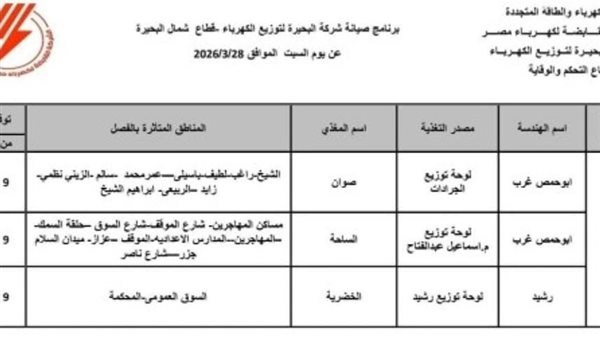 أعلنت شركة البحيرة لتوزيع الكهرباء عن فصل التيار الكهربائي، اليوم السبت 28 مارس 2026، عن عدد من المناطق والقرى بنطاق قطاعي وسط وشمال محافظة البحيرة، وذلك ضمن خطة الصيانة الدورية المبرمجة لتحسين كفاءة الخدمة واستقرار التغذية.