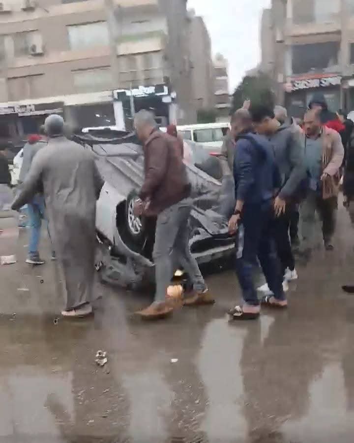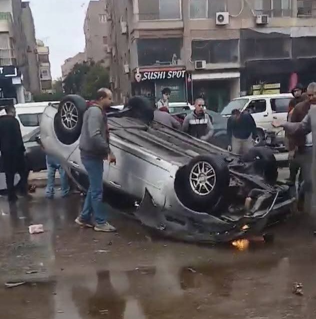 بسبب الطقس السيئ.. انقلاب سيارة أعلى محور حسب الله الكفراوي بالمعادى