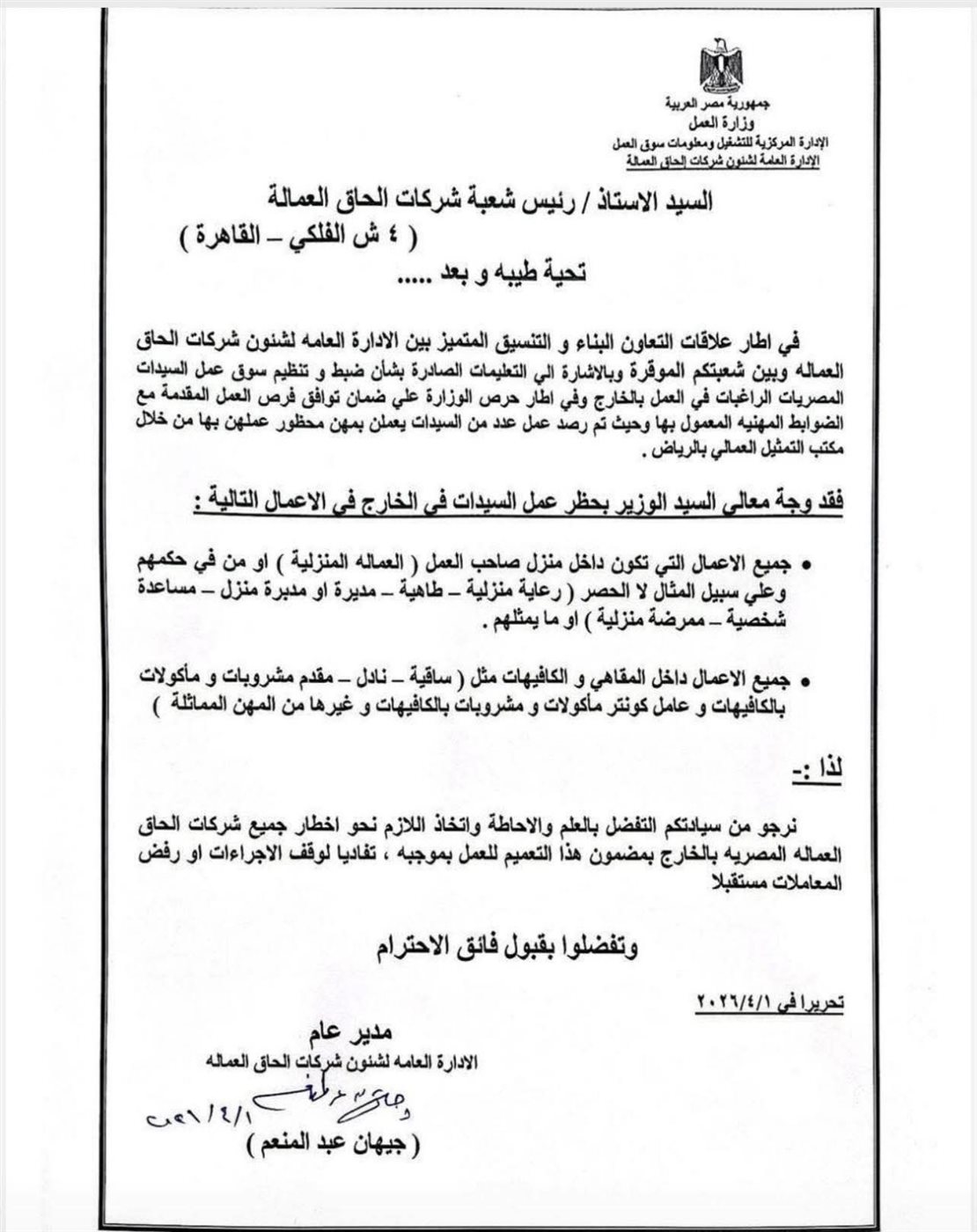 وجه حسن رداد، وزير العمل، بحظر عمل السيدات في الخارج في بعض الوظائف، وذلك في إطار توجيهات رسمية للحد من المخاطر المحتملة وحماية حقوق العاملات.