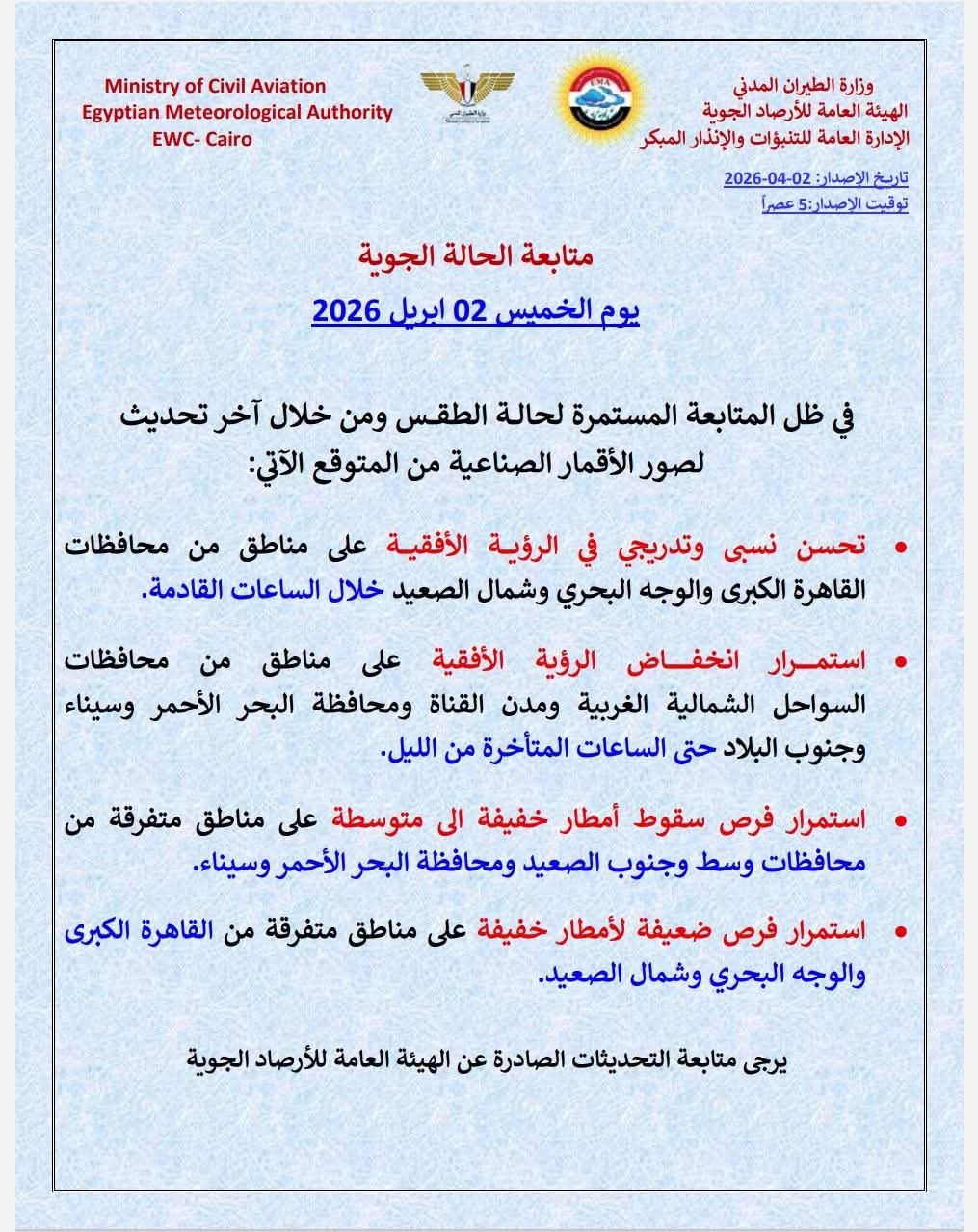 وأوضحت الأرصاد أن هناك فرصًا لـ سقوط أمطار خفيفة، قد تكون متوسطة أحيانًا على مناطق من محافظات جنوب الصعيد، وسلاسل جبال البحر الأحمر على فترات متقطعة، مع تكون سحب منخفضة على مناطق من شمال البلاد حتى القاهرة الكبرى، ومدن القناة، قد ينتج عنها سقوط رذاذ خفيف وغير مؤثر على بعض المناطق.