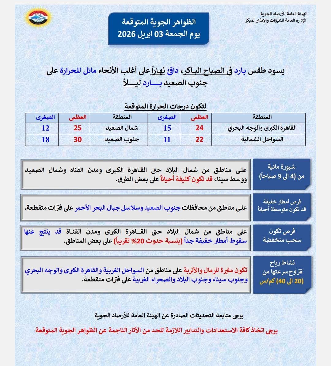 كشفت الهيئة العامة للأرصاد الجوية حالة الطقس اليوم الجمعة ٣ أبريل ٢٠٢٦، حيث يسود طقس بارد في الصباح الباكر، دافئ نهارًا على أغلب الأنحاء.