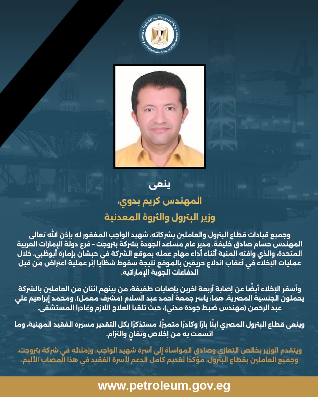 أول تعليق من «البترول» على استشهاد المهندس حسام خليفة بموقع عمله بالإمارات