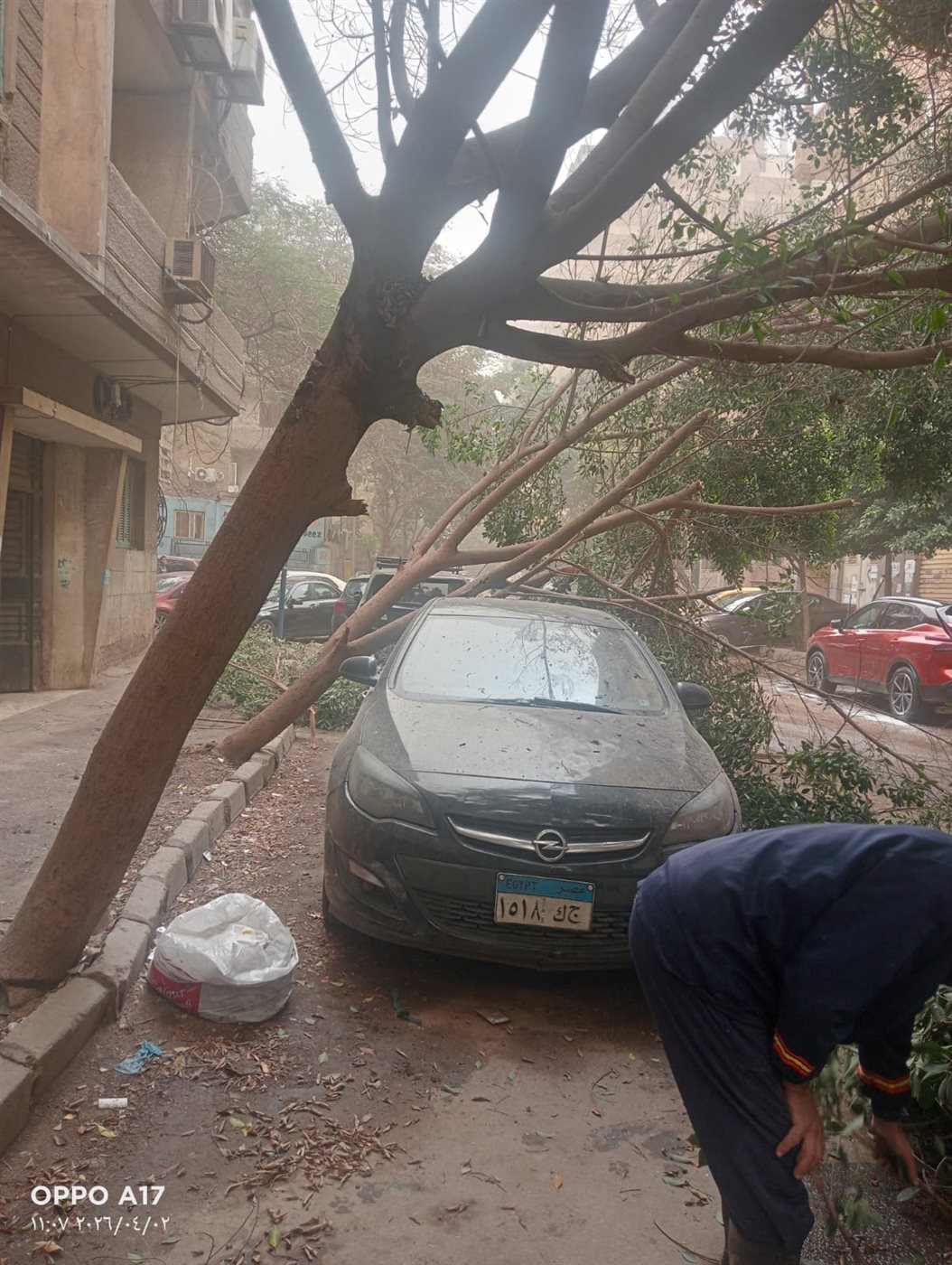 سقطت شجرة ضخمة على سيارة ملاكي متوقفة بـ13 شارع المحروسة بدائرة قسم شرطة العجوزة بمحافظة الجيزة.