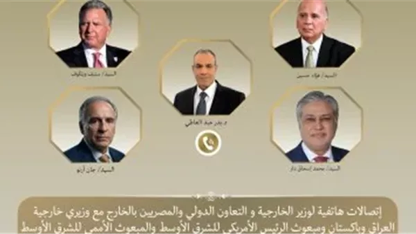 أجرى الدكتور بدر عبد العاطى وزير الخارجية والتعاون الدولي والمصريين بالخارج اتصالات مع الدكتور فؤاد حسين نائب رئيس مجلس الوزراء وزير خارجية جمهورية العراق، و محمد إسحاق دار نائب رئيس الوزراء ووزير خارجية باكستان، وستيف ويتكوف المبعوث الأمريكي الخاص للشرق الأوسط، وجان أرنو المبعوث الشخصي للسكرتير العام للأمم المتحدة للشرق الأوسط يوم أمس الاثنين.