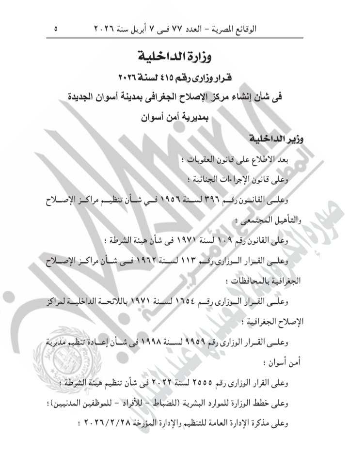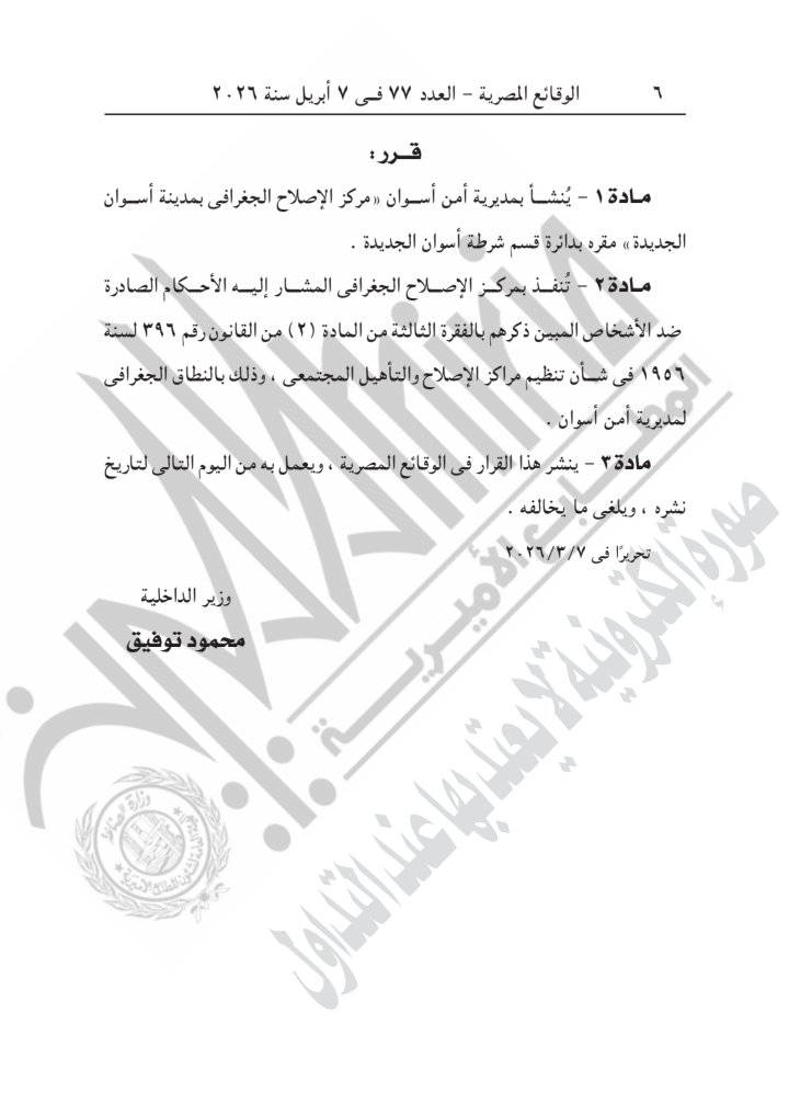 نشرت الجريدة الرسمية قرارًا صادرًا عن وزير الداخلية، حمل رقم 415 لسنة 2026، بشأن إنشاء مركز للإصلاح الجغرافي بمدينة أسوان الجديدة، في إطار خطة الوزارة لتطوير منظومة مراكز الإصلاح والتأهيل.