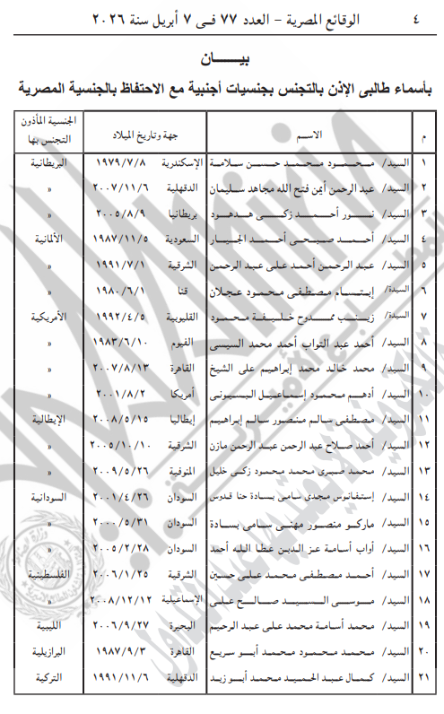 وتضمن القرار أن قائمة الأسماء تبدأ بالمواطن محمود محمد حسن سلامة، وتنتهي بالمواطن كمال عبد الحميد محمد أبو زيد، مع التأكيد على احتفاظهم جميعًا بالجنسية المصرية إلى جانب الجنسية الجديدة.