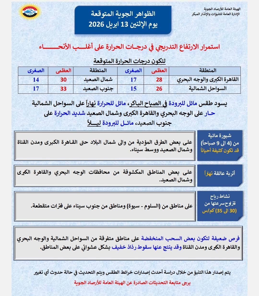 أعلنت الهيئة العامة للأرصاد الجوية تفاصيل حالة الطقس المتوقعة اليوم الإثنين 13 أبريل 2026، مؤكدة استمرار الارتفاع التدريجي في درجات الحرارة على أغلب أنحاء الجمهورية.