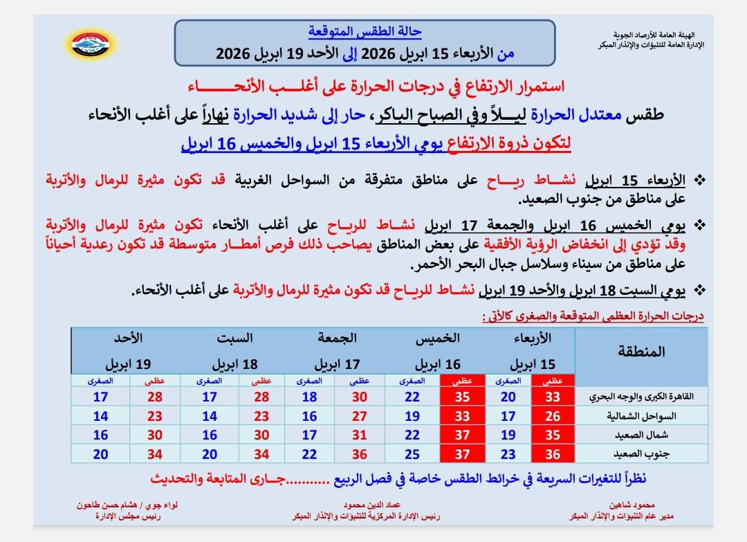 أعلنت الهيئة العامة للأرصاد الجوية تفاصيل حالة الطقس خلال الفترة من 15 إلى 19 أبريل 2026، مؤكدة استمرار الارتفاع في درجات الحرارة على أغلب أنحاء الجمهورية، في ظل تأثر البلاد بكتل هوائية صحراوية ومرتفع جوي في طبقات الجو العليا.