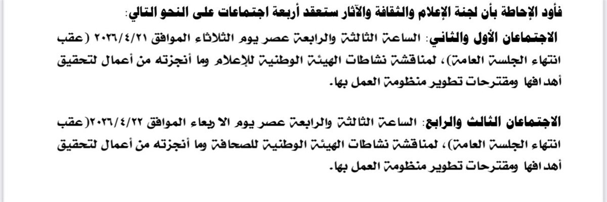 وأوضحت “البدوي” أن اللجنة ستعقد اجتماعين يوم الثلاثاء الموافق 21 أبريل، في تمام الساعة الثالثة والرابعة عصرًا، لمناقشة نشاطات الهيئة الوطنية للإعلام، وما حققته من إنجازات خلال الفترة الماضية في سبيل تحقيق أهدافها، إلى جانب استعراض أبرز التحديات التي تواجهها، وطرح مقترحات لتطوير منظومة العمل الإعلامي.
