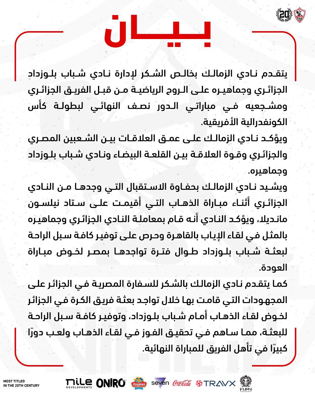 وجاء نص بيان نادي الزمالك على النحو التالي: يتقدم نادي الزمالك بخالص الشكر لإدارة نادي شباب بلوزداد الجزائري وجماهيره على الروح الرياضية من قبل الفريق الجزائري ومشجعيه في مباراتي الدور نصف النهائي لبطولة كأس الكونفدرالية الأفريقية.