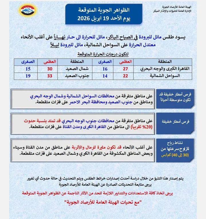 كشفت الهيئة العامة للأرصاد الجوية، حالة الطقس المتوقعة اليوم الأحد 19 أبريل 2026، حيث يسود طقسا مائلا للبرودة في الصباح الباكر، مائلا للحرارة إلى حار نهاراً على أغلب الأنحاء، معتدل الحرارة على السواحل الشمالية، مائل للبرودة ليلاً.